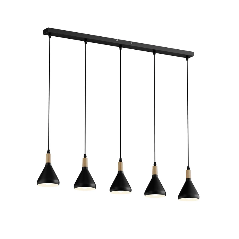 La lámpara tiene un soporte de techo rectangular pintado de negro y cinco pantallas en forma de cono en un color a juego, conectadas a través de cables fibrosos. La parte superior de las pantallas tiene finos detalles de madera que aparecen claramente entre los colores oscuros y le dan a la lámpara una expresión natural. Combinado con el diseño simple, hace que la lámpara sea perfecta para interiores escandinavos, minimalistas o modernistas.