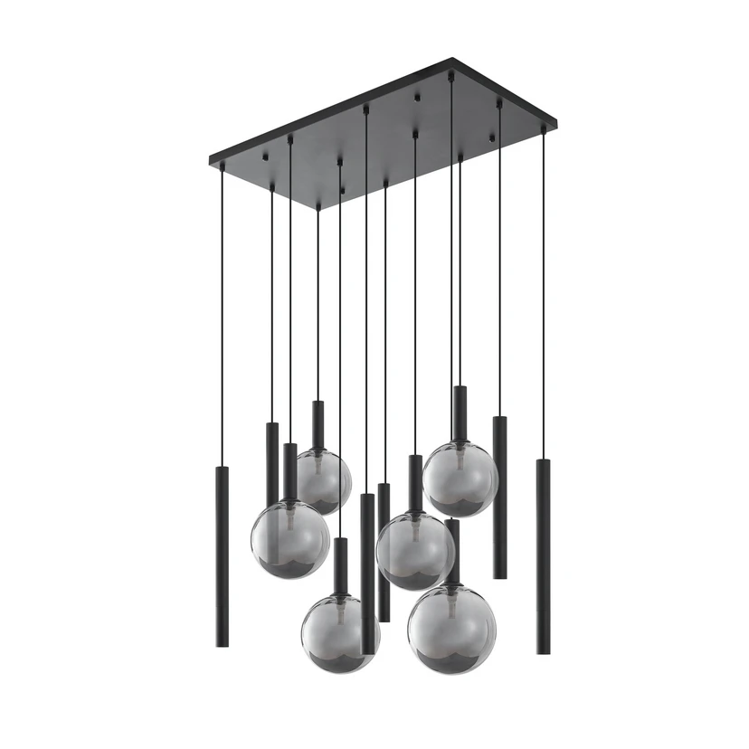 La lámpara colgante Lumavia combina un diseño moderno con materiales de alta calidad, como el vidrio y el hierro. La combinación del acabado en negro y gris humo confiere a la lámpara una elegancia atemporal que se integra a la perfección en los conceptos de vivienda modernos. Con sus doce fuentes de luz, proporciona una iluminación uniforme e impresionante que crea un ambiente elegante, especialmente en comedores.